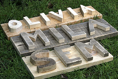 Handgemaakte naambordjes van sloophout. De letters worden met de hand uitgezaagd en vervolgens stevig bevestigd op een plank. Aangezien er gebruik wordt gemaakt van echt sloophout, is geen letter hetzelfde. Zowel dikte, kleur als vorm zullen afhankelijk van het houtaanbod variëren.